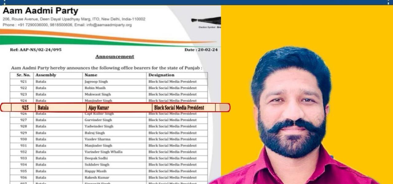 ਅਜੇ ਕੁਮਾਰ ਆਮ ਆਦਮੀ ਪਾਰਟੀ ਦੇ ਹਲਕਾ ਬਟਾਲਾ ਦੇ ਬਲਾਕ ਸੋਸ਼ਲ ਮੀਡੀਆ ਇੰਚਾਰਜ ਬਣੇ , ਪੱਤਰਕਾਰਾਂ ਨਾਲ ਗੱਲਬਾਤ ਕਰਦਿਆਂ ਹੋਇਆ ਉਹਨਾਂ ਕਿਹਾ ਮੈਂ ਤਹਿ ਦਿਲੋਂ ਧੰਨਵਾਦੀ ਹਾਂ ਹਾਈ ਕਮਾਂਡ ਦਾ ਅਤੇ ਵਿਧਾਇਕ ਅਮਨ ਸ਼ੇਰ ਸਿੰਘ ਸ਼ੈਰੀ ਕਲਸੀ ਜੀ ਦਾ , ,, ਬਟਾਲਾ ਤੋਂ ਆਮ ਆਦਮੀ ਪਾਰਟੀ ਪ੍ਤੀ। ਸੇਵਾਵਾਂ ਨਿਭਾ ਰਹੇ ਅਜੇ ਕੁਮਾਰ ਨੂੰ ਹਾਈ ਕਮਾਂਡ ਵੱਲੋਂ ਦਿੱਤੀ ਗਈ ਵੱਡੀ ਜਿੰਮੇਵਾਰੀ ਮਿਲੀ ਹੈ ਕਿਹਾ ਕਿ ਪਾਰਟੀ ਪ੍ਰਤੀ ਲਗਨ ਨਾਲ ਕੰਮ ਕਰ ਰਹੇ ਹਾਂ ਅਤੇ ਅਗਾਹਾਂ ਵੀ ਵੱਧ ਚੜ ਕੇ ਪਬਲਿਕ ਦੀਆਂ ਮੁਸ਼ਕਿਲਾਂ ਨੂੰ ਸੁਣ ਕੇ ਹੱਲ ਕਰਵਾਵਾਂਗੇ।, ਗੱਲਬਾਤ ਕਰਦੇ ਆ ਉਹਨਾਂ ਕਿਹਾ ਕਿ ਮੇਰੇ ਘਰ ਦੇ ਦਰਵਾਜ਼ੇ ਜਨਤਾ ਦੇ ਲਾਈ ਦਿਨ ਰਾਤ ਖੁੱਲੇ ਹਨ ਜਦ ਵੀ ਕਿਸੇ ਨੂੰ ਕੋਈ ਮੁਸੀਬਤ ਜਾਂ ਮੁਸ਼ਕਿਲ ਹੁੰਦੀ ਹੈ ਤਾਂ ਬੇਝਿਜਕ ਹੋ ਕੇ ਮੈਨੂੰ ਮਿਲ ਸਕਦਾ ਹਨ
