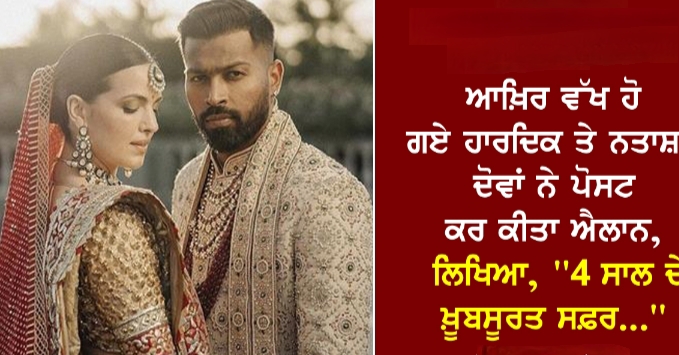 ਬੀਤੇ ਕਈ ਦਿਨਾਂ ਤੋਂ ਮੀਡੀਆ ‘ਚ ਖ਼ਬਰਾਂ ਸਾਹਮਣੇ ਆ ਰਹੀਆਂ ਸਨ ਕਿ ਭਾਰਤੀ ਸਟਾਰ ਆਲਰਾਊਂਡਰ ਹਾਰਦਿਕ ਪੰਡਯਾ ਤੇ ਉਨ੍ਹਾਂ ਦੀ ਪਤਨੀ ਨਤਾਸ਼ਾ ਇਕ ਦੂਜੇ ਤੋਂ ਵੱਖ ਹੋਣ ਦੀ ਯੋਜਨਾ ਬਣਾ ਰਹੇ ਹਨ। ਇਸੇ ਦੌਰਾਨ ਇਸ ਖ਼ਬਰ ‘ਤੇ ਹਾਰਦਿਕ ਪੰਡਯਾ ਤੇ ਨਤਾਸ਼ਾ ਦੀ ਇੰਸਟਾਗ੍ਰਾਮ ਪੋਸਟ ਨੇ ਮੋਹਰ ਲਗਾ ਦਿੱਤੀ ਹੈ, ਜਿਸ ‘ਚ ਉਨਾਂ ਦੋਹਾਂ ਨੇ ਆਪਣੇ 4 ਸਾਲਾ ਰਿਸ਼ਤੇ ਨੂੰ ਖ਼ਤਮ ਕਰਨ ਦਾ ਐਲਾਨ ਕਰ ਦਿੱਤਾ ਹੈ।