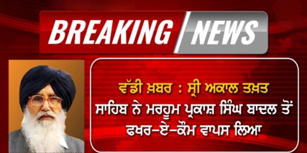 ਵੱਡੀ ਖ਼ਬਰ : ਸ੍ਰੀ ਅਕਾਲ ਤਖ਼ਤ ਸਾਹਿਬ ਨੇ ਮਰਹੂਮ ਪ੍ਰਕਾਸ਼ ਸਿੰਘ ਬਾਦਲ ਤੋਂ ਫਖਰ-ਏ-ਕੌਮ ਵਾਪਸ ਲਿਆ